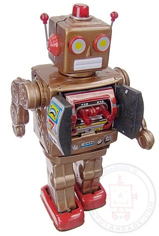 Bronze Age Robot D Cell Rare ME100 : Our D Cell action robot has travelled to our time from the Bronze Age. : Our D Cell action robot has travelled to our time from the Bronze Age. This Bronze robot is a special version of our famous Mr D Cell with a handsome shiny golden body. He walks forward on his red boots looking for a target. Suddenly, his upper body fully rotates three times and his silver chest panels open up with glowing guns blazing and shooting sounds. Then he does it again! He is a reproduction of a famous Japanese Robot Electron ME100 of the 1950-1960’s. A very special classic robot gift!