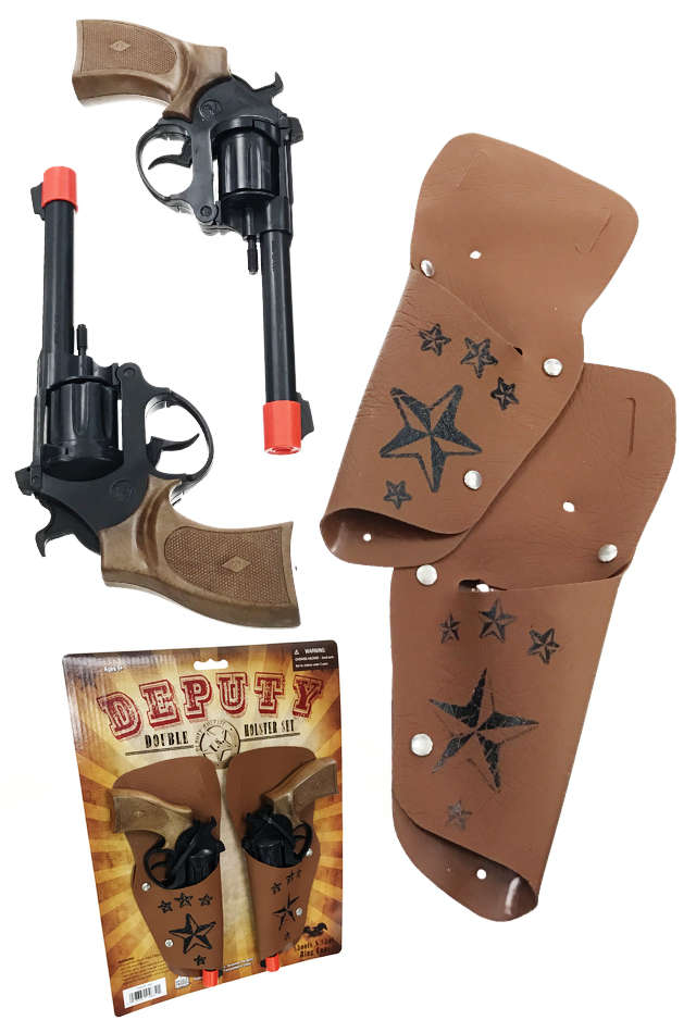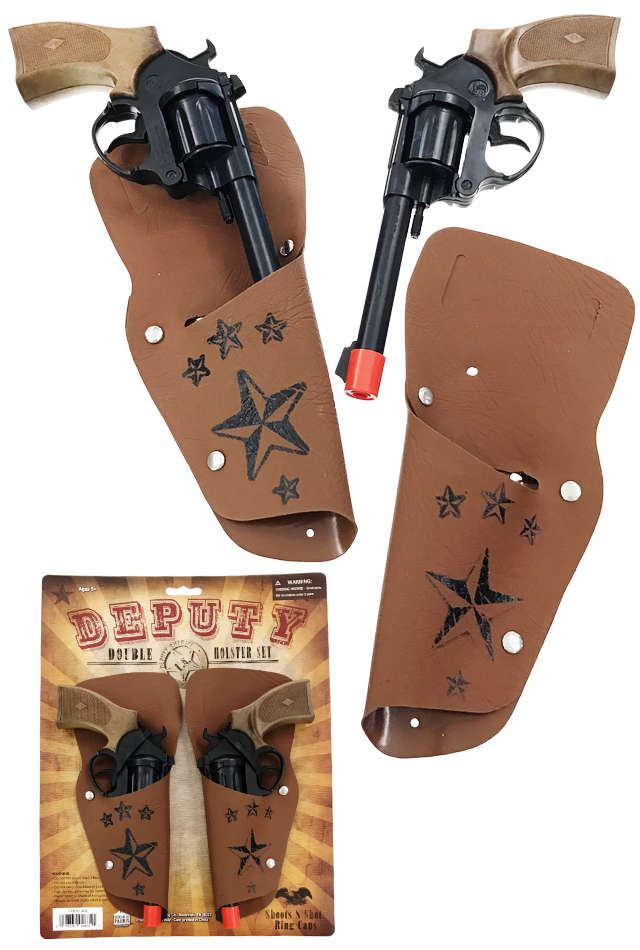Deputy Sheriff Double Holster 8 Shot Ring Cap Gun Set : A classic Deputy SheriffDouble Holster gun set with 2 brown handled toy cap guns. : A classic Deputy SheriffDouble Holster gun set with 2 brown handled toy cap guns. Our 1950’s Western-style set comes with 2deluxe plasticgun set featuresreal trigger and hammer action with a real rotating cylinder. The twobrown double holsters feature with slots to slide on your cowboy belt. Share a gun with your pardner or perform some fancy gunslinger tricks! Don’t forget your ammunition with our Cowboy 8 Ring Caps Refill. – Super Bang Ring Caps Do Not Work with Parris Manufacturing Cap Guns.