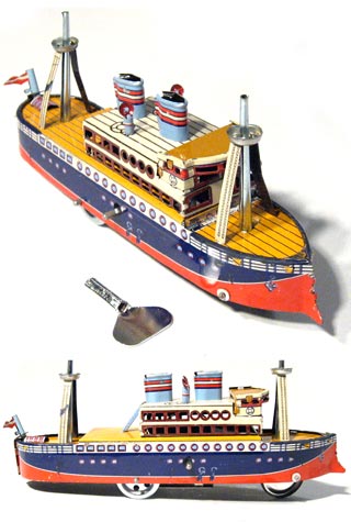 Pleasure Liner Steamship Tin Wind Up : Let’s go on a pleasure cruise! This steamship is an exacting replica of the 1932 original tin toy by Paya of Spain.
